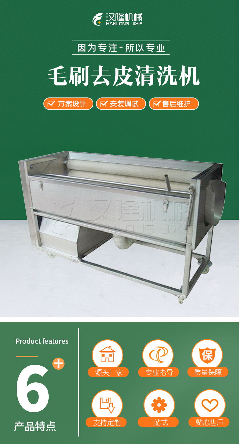 毛刷(shuā)去皮清洗(xǐ)機為我公司生產的果蔬清洗去皮設備。具有結構新穎緊奏、節能gao效(xiào)、生產效率高、清洗(xǐ)去皮che底、對果(guǒ)蔬損傷小(xiǎo)、使用(yòng)範圍廣等特點。該機廣泛用於胡蘿卜(bo)、馬鈴薯(shǔ)、土豆等果蔬的(de)去皮清洗(xǐ),尤其(qí)適用生長在泥土中果蔬的清洗和去皮。