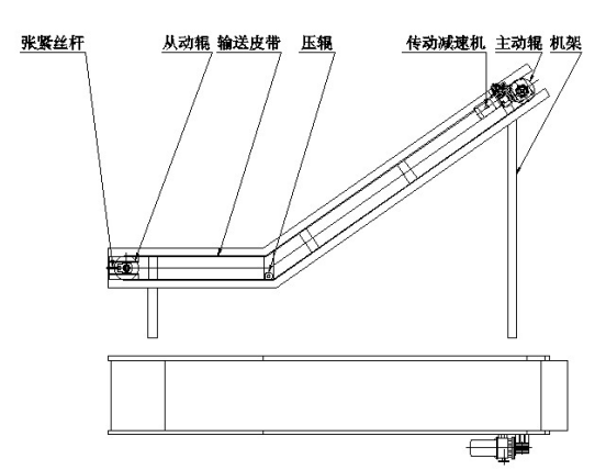示意圖①:該提(tí)升機(jī)主要由機架、進料(liào)鬥、張緊絲杆、輸送皮(pí)帶、主動輥、從動輥、壓輥、傳動減速機等部(bù)件組成。