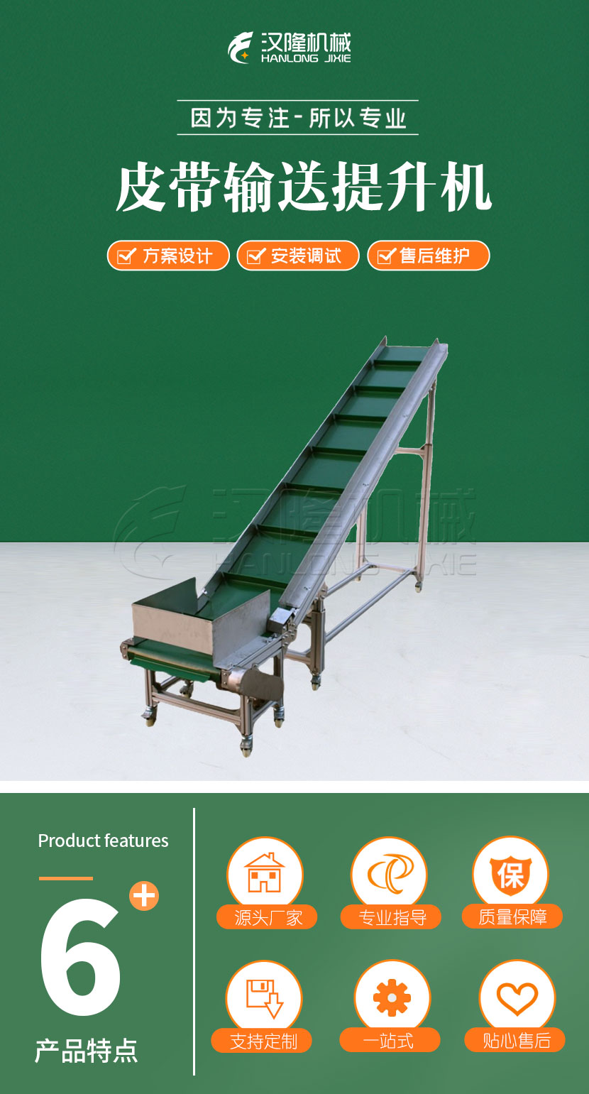 果(guǒ)品送(sòng)入本機的進料鬥中,由主動棍帶動輸送(sòng)皮帶,將果品輸送並提升至下道工序(xù)。該機機架為全不鏽(xiù)鋼材料製造,可根據用戶要求采用多種型 材製造,也可增加噴淋管和集水槽等(děng)裝置。