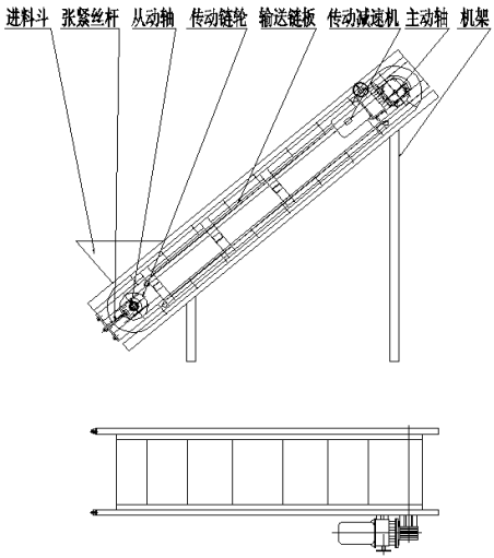 該提升機由機(jī)架、進(jìn)料鬥、張緊絲杆、輸送鏈板、主動軸、從動(dòng)軸、傳送(sòng)鏈輪、傳動減速(sù)機等部件組成。