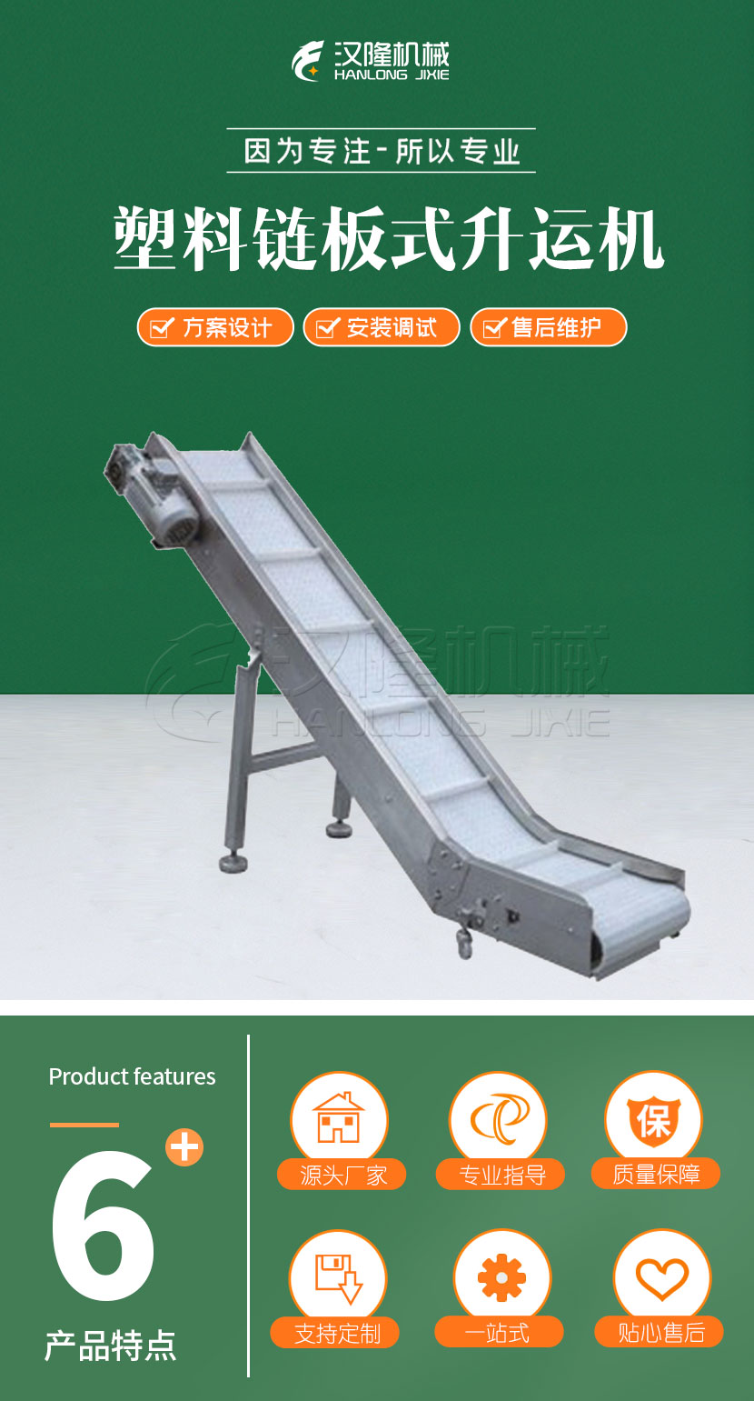 該設備采用食品級塑料刮板作為輸送載體,適用於食品行業各類果蔬的提升輸送。