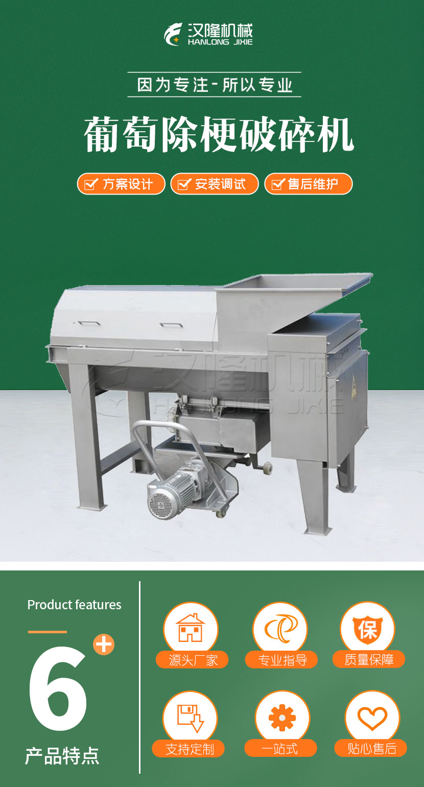 本設備是葡萄酒廠(chǎng)處理(lǐ)新鮮葡萄的專用設備。可(kě)對葡萄進行果梗分離、清除梗(gěng)枝、破碎(suì)等工(gōng)藝過程。是中小型葡萄酒廠理(lǐ)想的葡萄前期加工設備。主要技術(shù)特點是先除梗後破碎,設有進料螺旋,可實現定量進料。破碎輥為(wéi)無毒高彈性橡膠製造, 對葡萄果核無損傷。整機與葡萄接觸部分及外露部分全部用優質不鏽鋼材料製造。