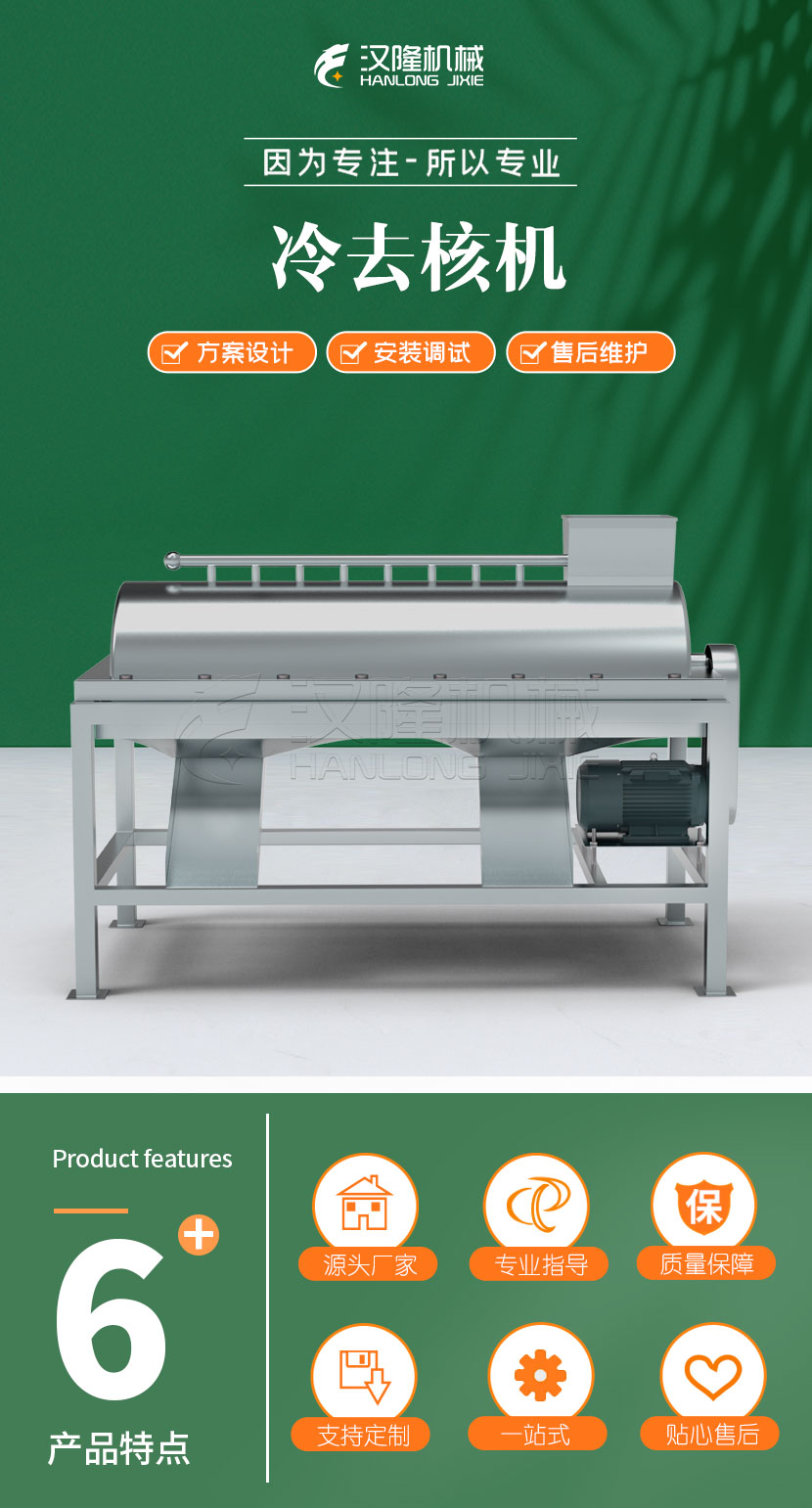 冷去核機由傳動減速機、軸承座、機架、進料(liào)鬥、傳動輥、分離板、出料鬥、出核鬥等部件組成。工作原理:物料由進料鬥進入去核工作(zuò)室,由於(yú)去(qù)核室(shì)內輥子上置有不同角度的分離板(bǎn),使水果的果肉與果核分離。被分離的果肉從篩網孔中落入出料鬥中,果核(hé)則由數個分離板組成的螺旋,向出核處移動由出核鬥排出,篩網和分(fèn)離板之間的間(jiān)隙可試處理物(wù)料核的大小而(ér)定。