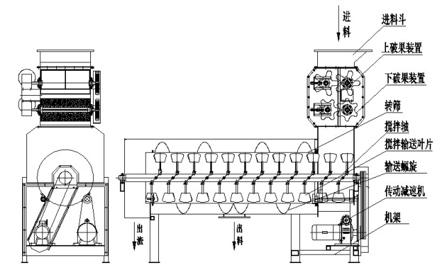 工作原理:石榴從進料鬥進入上(shàng)破(pò)果裝置,在兩壓輥之間對(duì)壓的作(zuò)用下將壓(yā)開,粗破果後然後進入下破果裝置,下破果裝置再次將石榴擠壓,這時經過兩級擠壓的(de)石榴已基本殼肉分(fèn)離,並落入分離裝置。上下破果輥均為彈性結(jié)構,間隙可調。經破殼的石榴在攪拌軸上的(de)攪拌輸送葉片的作用下,果肉從篩孔落下,並在(zài)轉篩外螺旋的作用送至出料口,而石榴皮(pí)在攪拌輸送葉片的作用下從尾部排出。從(cóng)本機出來的石榴果肉及汁可用(yòng)螺杆泵輸送至下一道工序。