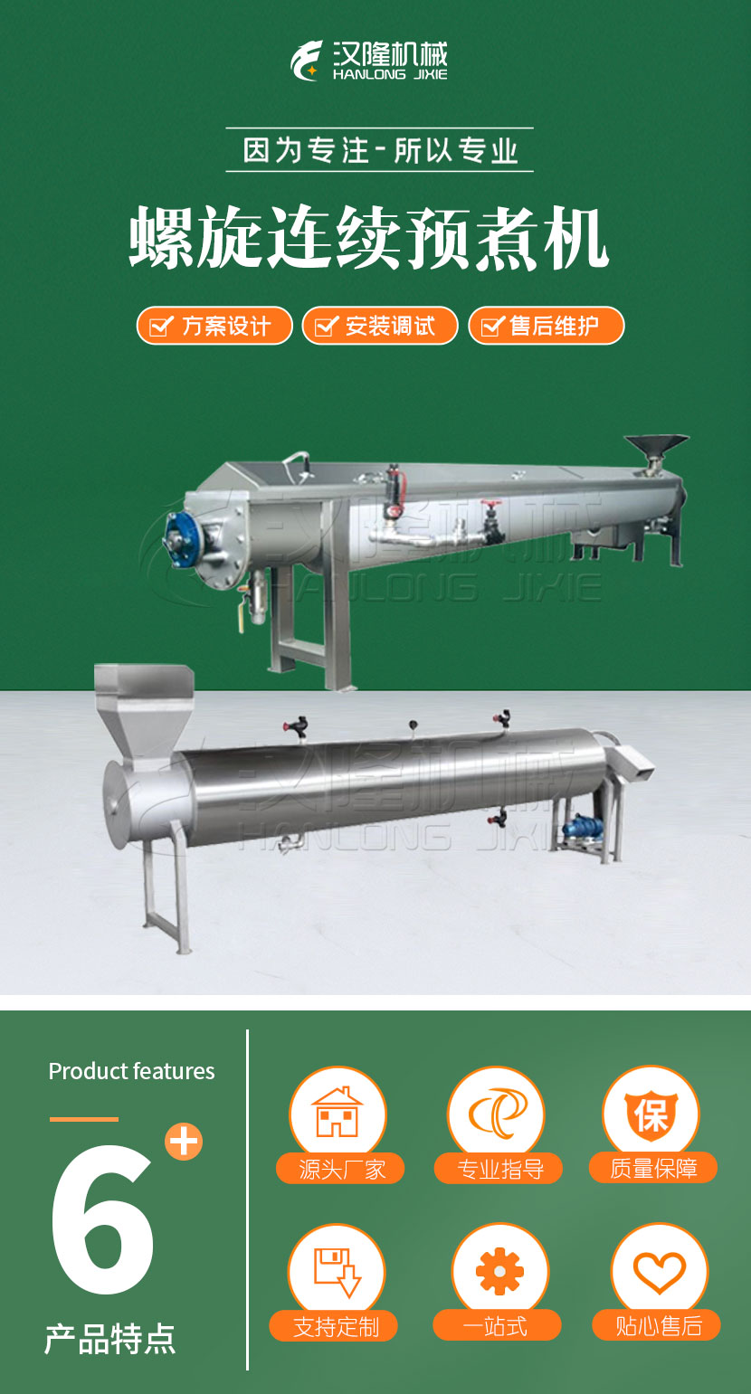 工作原理:由進料鬥加入適量水,通過蒸汽加熱,蒸汽進入夾套通過殼(ké)體表麵傳熱,當水溫達到所需溫度時,從進料鬥送進物料,經轉動(dòng)的(de)輸送螺旋邊推進邊預煮,然後由出料翻板將物料從出料口送出。該機無級調(diào)速,可連續作業,適用多種果蔬及肉類預煮。