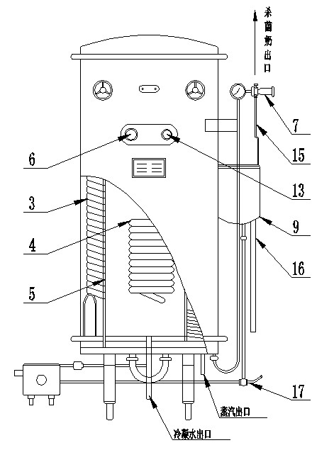 本機(jī)屬手控式滅菌機,滅菌溫度由角式(shì)截止(zhǐ)閥(11)(見圖1、2)來調節、出(chū)料溫度可(kě)通過角式截止閥(12)來改變。蒸汽的壓力表(13)、滅菌溫度表(6)以及出料溫度表(14)均裝在(zài)主機上。