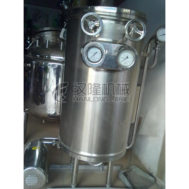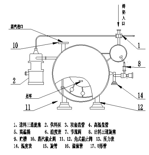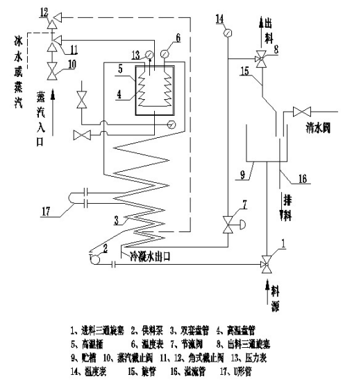 圖4的裝置是用來排除突然停電所發生的故(gù)障的,在正常生產時,應關閉進水(shuǐ)和放水截止閥,讓冷凝水從疏水(shuǐ)器中排出(chū)。如發生突然停電時,則要迅速並閉蒸(zhēng)汽閥,開啟放水截止閥,待放淨高溫桶內的(de)蒸汽後才關閉,這時應立即開啟進水截止(zhǐ)閥,讓自來水進(jìn)入高溫桶,這樣就能有效地防止物料在盤(pán)管中由於受阻而繼續(xù)加溫的焦化積垢想象。